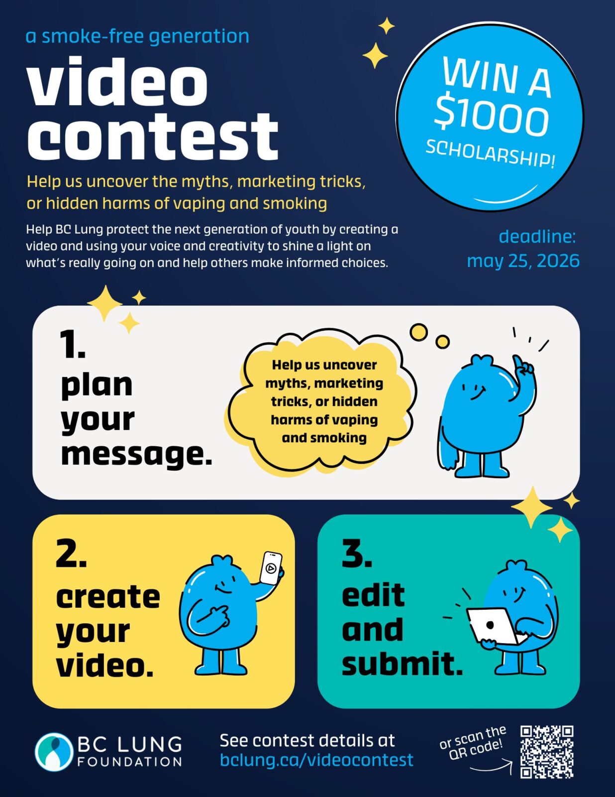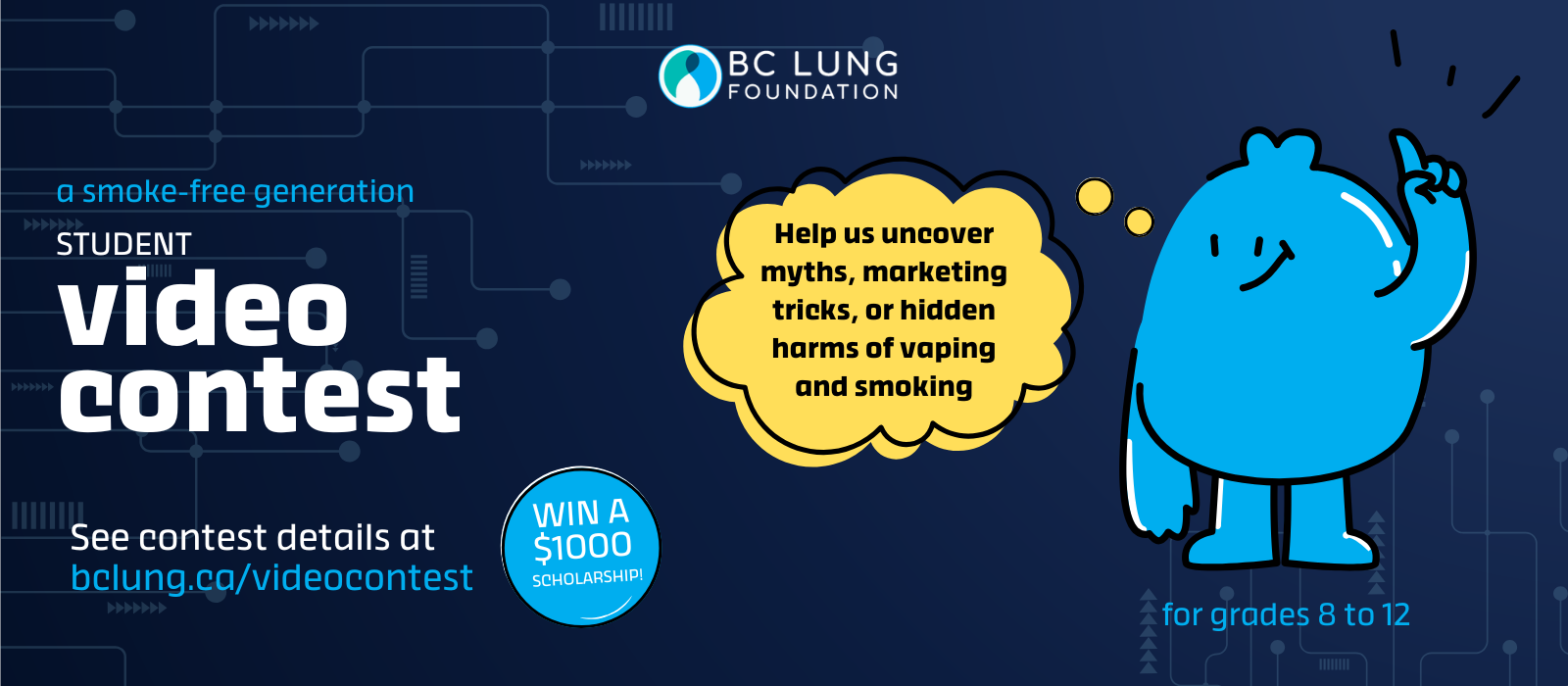 Help BC Lung protect the next generation of youth by creating a video on uncovering myths, marketing tricks, or hidden harms of vaping and smoking. You could win a $1000 scholarship!